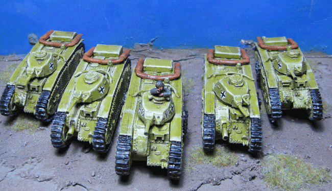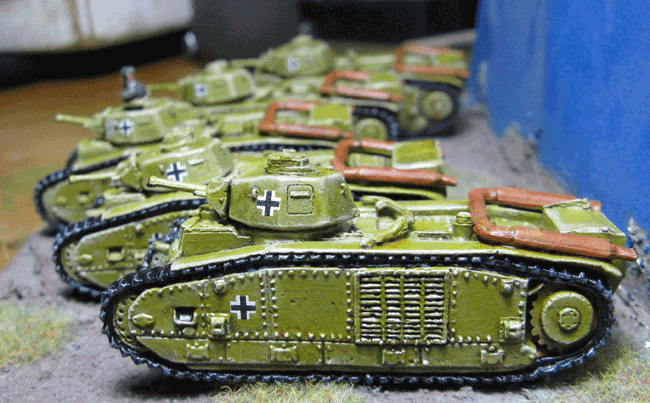 In einer Beutepanzerkompanie kann ein schwerer Panzerzug aus fünf Char-B2´s aufgestellt werden, von dem optional zwei Fahrzeuge zu Flammwerferfahrzeugen aufgewertet können.So einen Zug habe ich nun bemalt.