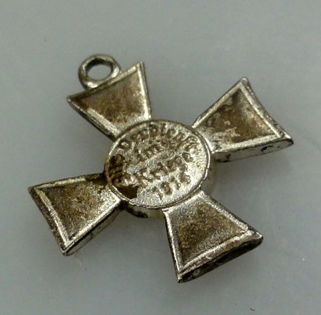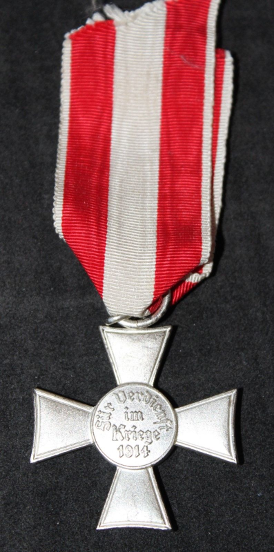 Rückseite: versilbert, Kreuzarme mit kleinem Rand, rundes Mittelschild mit der Aufschrift: oben halbrund: – Für – Verdienst – darunter 3 zeilig: – im – Kriege – 1914 -