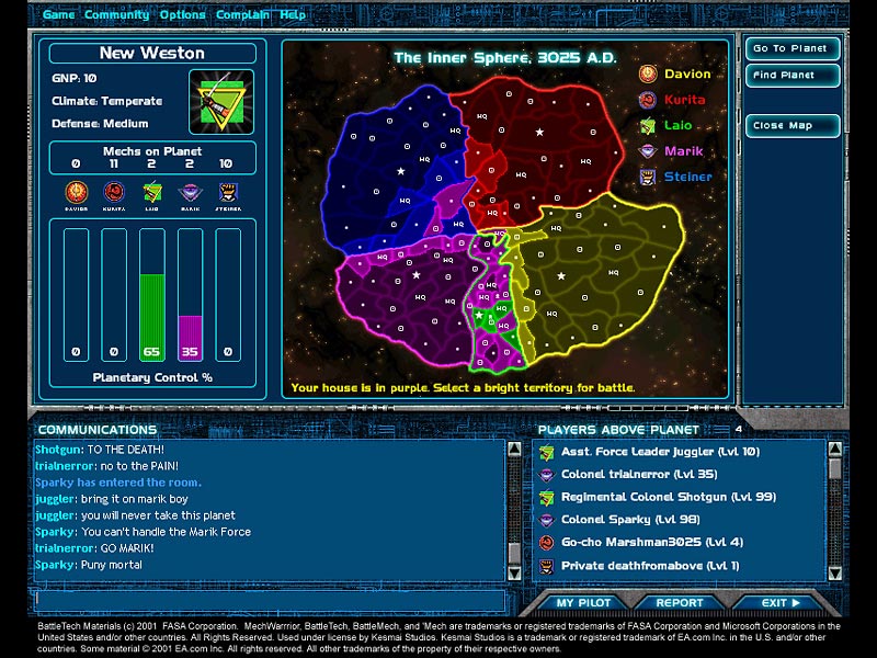ACHTUNG: Wie wir am 25.11.2001 berichtet haben, stellte Electronic Arts die Entwicklung von Multiplayer BattleTech 3025 ein und hat alle Server zum 6.12.2001 abgeschaltet. Das Projekt ist damit beendet worden und steht nicht mehr zur Verfügung.