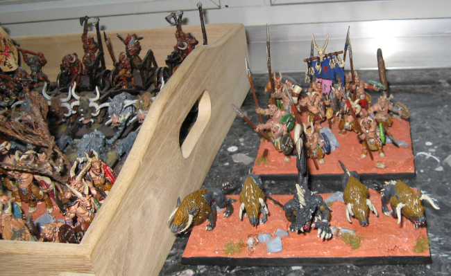 Aus meinem P500 stammen folgende Einheiten: Häuptling, Horde Krieger, Regiment Speerträger und ein Trupp Beastpacks.