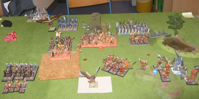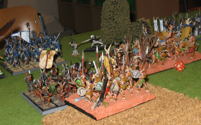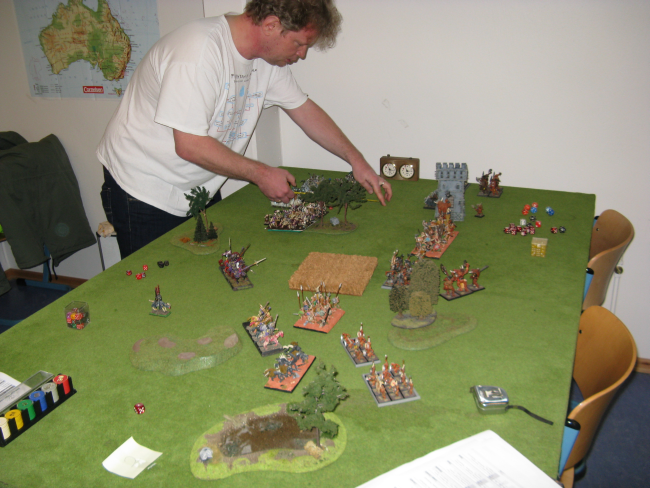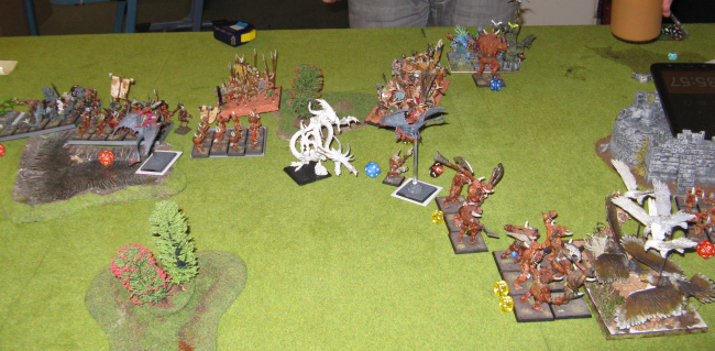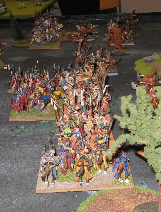 Kleinere Kampfgefechte gab es an allen Ecken und Enden. Erster Höhepunkte war der Charge seiner Monsterhorde in meine Horde. Er nahm sie locker in einer Runde raus. Den Charge durch die dahinter befindlichen Einheiten überlebte diese aber nicht und schwubs das Loch in der Mitte (siehe oben das Bild.).