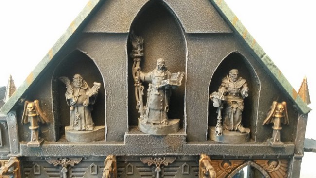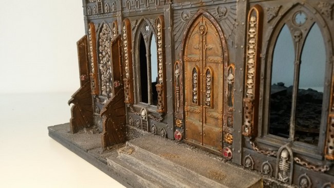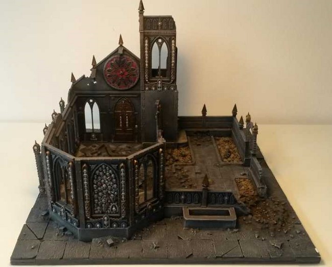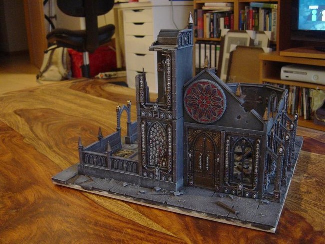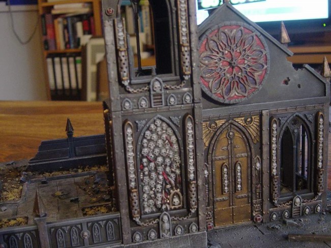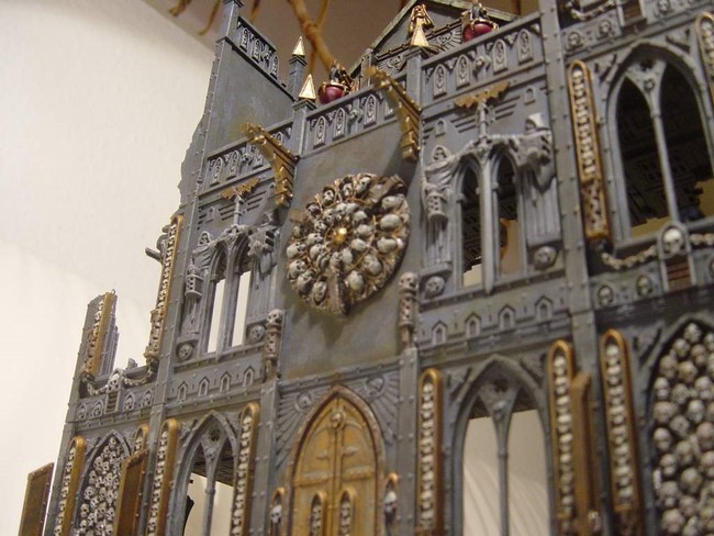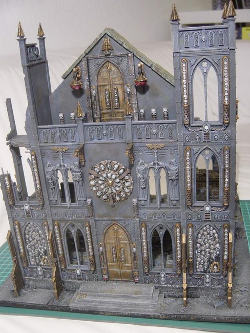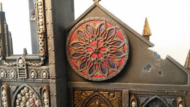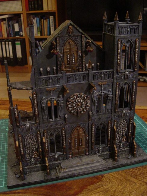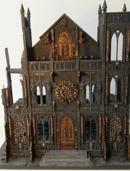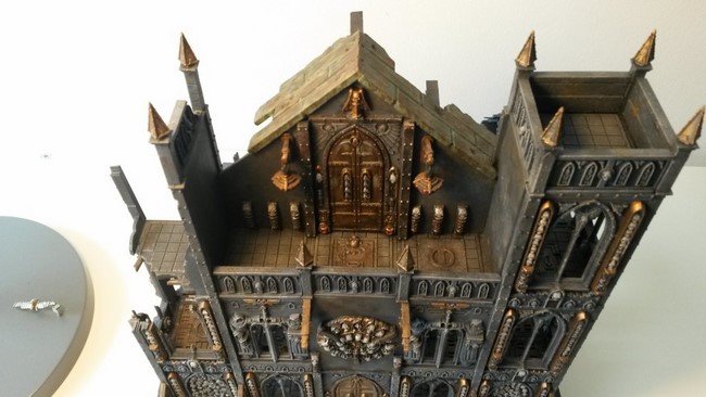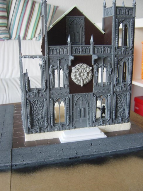 Ich habe begonnen mein erstes Gebäude zu bauen. In der Planung wollte ich ein Gebäude mit typischer gotischer Doppelturmfassade, wie man es von vielen Sakralbauten aus der Zeit kennt(siehe Notre Dame). Unten seht ihr erste Bilder. Ich wollte unbedingt einen Giebel, den ich dann aus Plastic-Card gebastelt habe. Die Bausätze von GW sehen keine Giebel vor aber ich finde die Gebäude gewinnen sehr an Realismus und Größe, wenn ein Giebel existiert. Das Rosettenfenster als ebenfalls typisch gotisches Element ist von Scibor und passt einfach fantastisch zum Basilica-Bausatz. Es fehlen noch ein paar Reste des Daches. Außerdem möchte ich das Gebäude noch auf ein Fundament setzten.