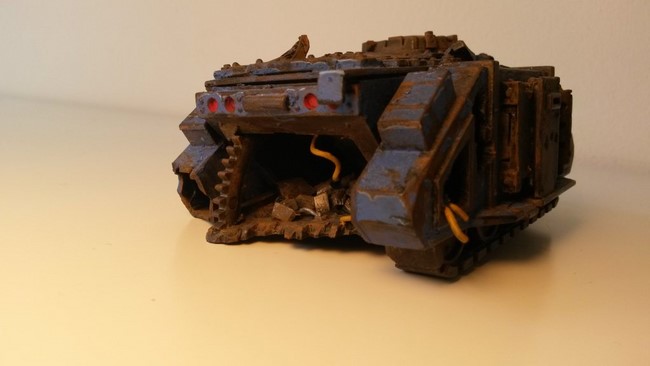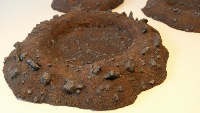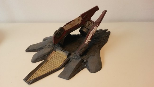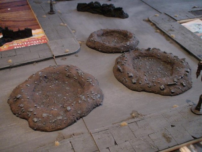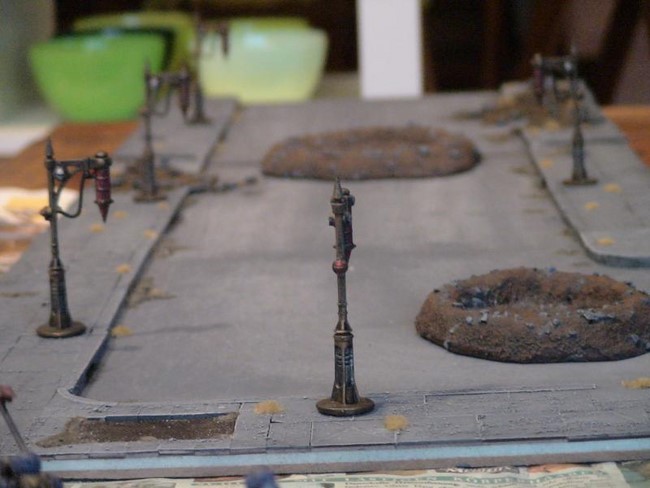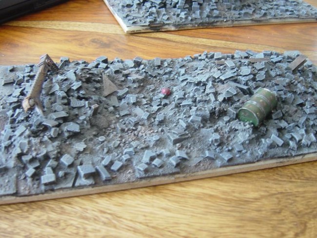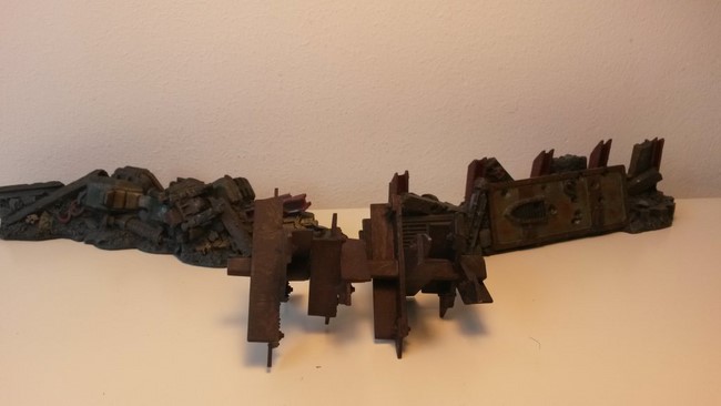 1x Rhinowrack, 3x Krater, 6x Straßenkampfbarrikaden (hier nur die 3x bemalten dargestellt, noch 3x schwarz grundierte vorhanden) und 2x Droppod-Wracks.