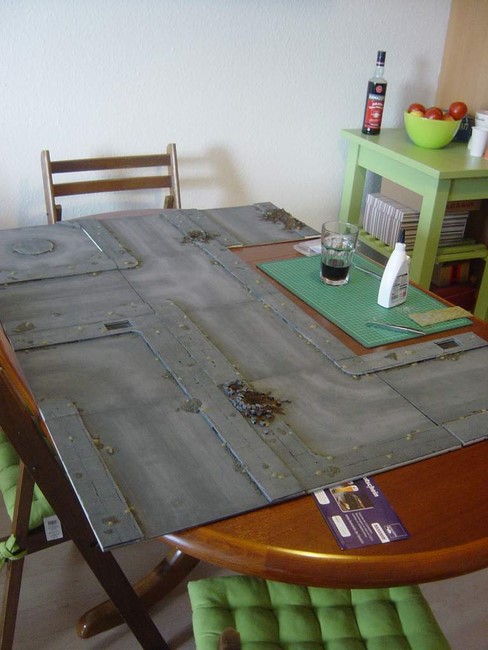 Bisher habe ich den Tisch fertiggestellt und mich für eine 120*120cm große Unterlage entschieden, die Unterlage für ein Spielfeld aus größtenteils 30*30cm großen Platten sein soll. Visionär wäre dann eine Erweiterung auf 180*120cm.