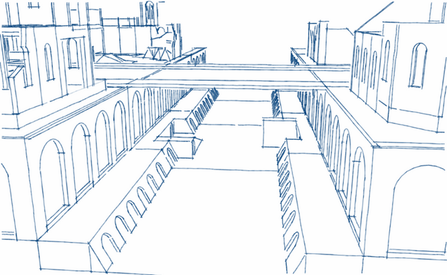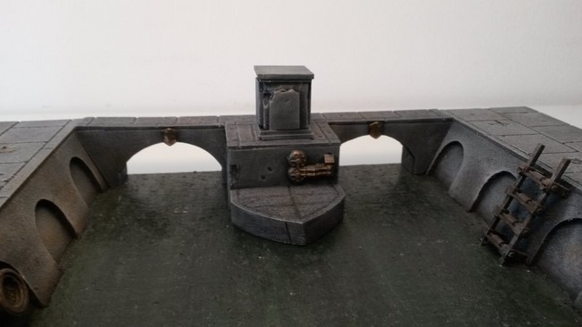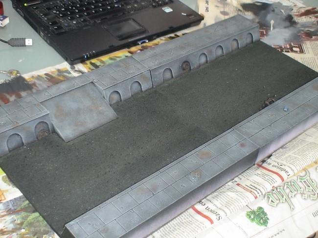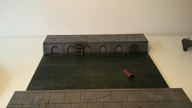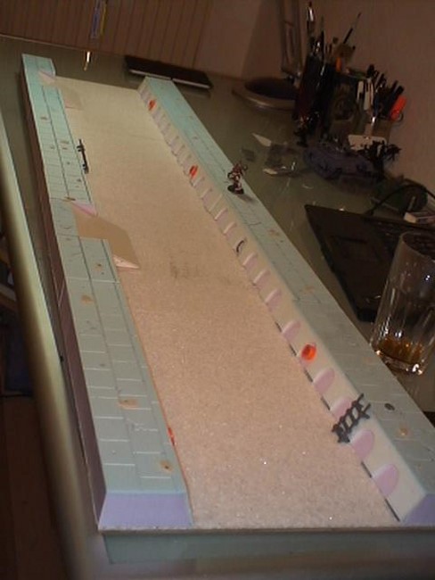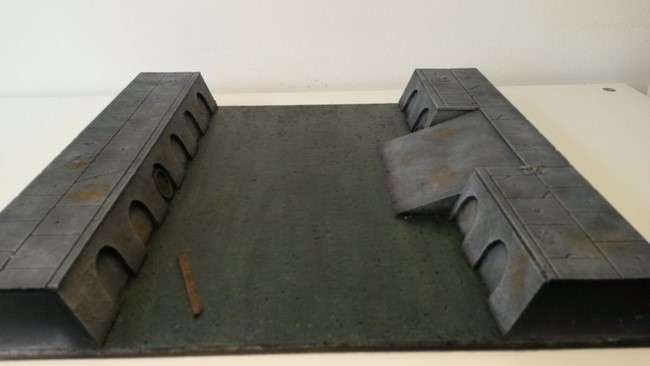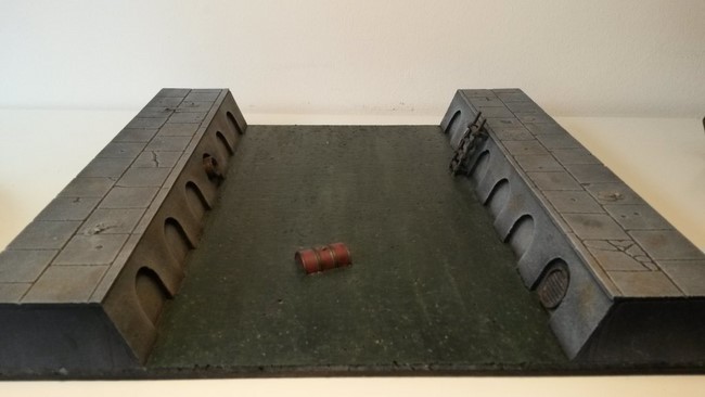 Melior wollte ursprünglich einen mehrschichtigen Aufbau eines Kampfgeländes bauen, was in Modulen zu 30x30cm untergliedert ist. Wie er später feststellte ist der Aufwand hierzu sehr groß. In letzter Konsequenz bliebt es bei einem Wassergraben mit Brücke und den erhöhten Stadtgeländemodulen. trotzdem kann man an den Skizzen gut erkennen wohin das Projekt mal gehen soll.