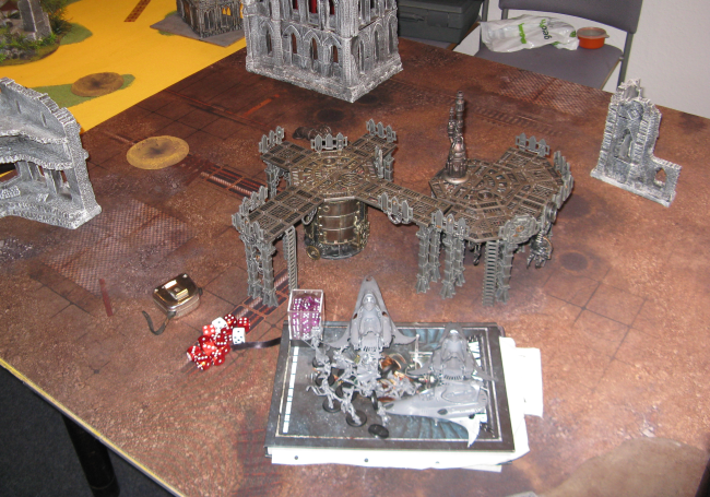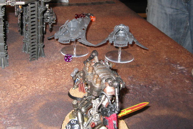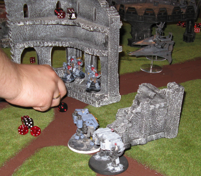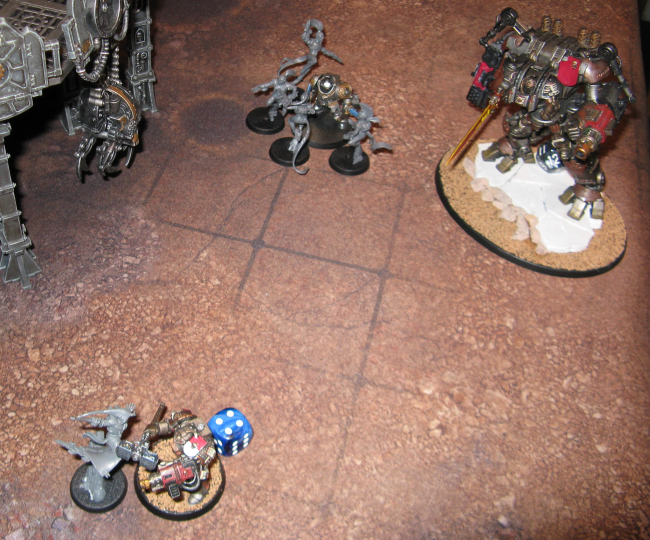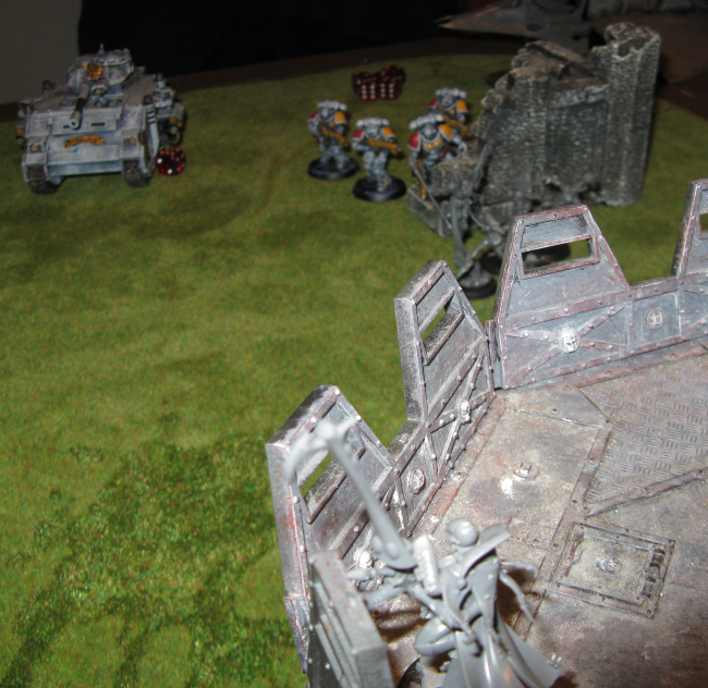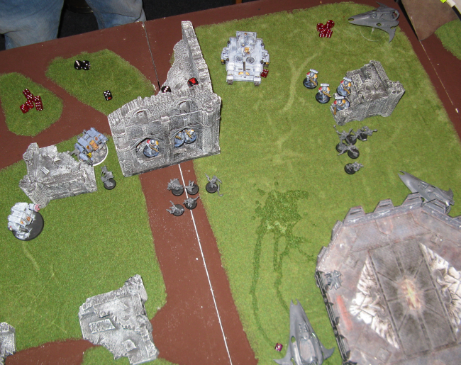 Mein Problem war im ersten Moment der Ritter, da ich nicht einschätzen konnte wie ich ihn bekämpfen sollte. Rückblickend wäre gezielter Beschuß durch die Fusionsblaster am einfachsten gewesen. Nach der Aufstellung habe ich daher versucht meinen Schwerpunkt schnell zu verlegen um einzelne Trupps aufzurauchen. Leider konterte er erfolgreich mit seinen Einheiten, die entweder aus der Reserve kamen bzw. noch mindestens einmal porten durften.